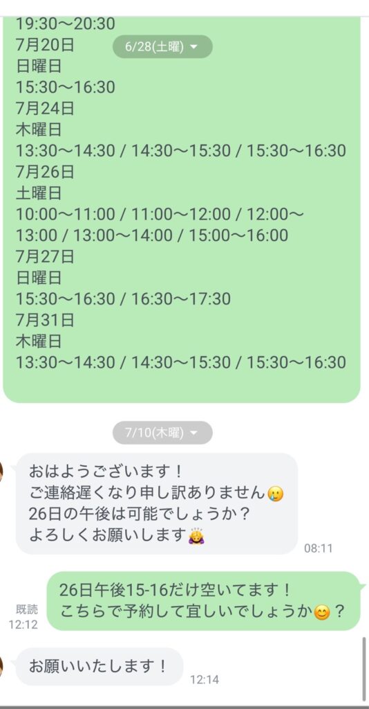 私の方で空き枠をお伝えする場合や、生徒様から直接希望日を送っていただく場合もございます。
